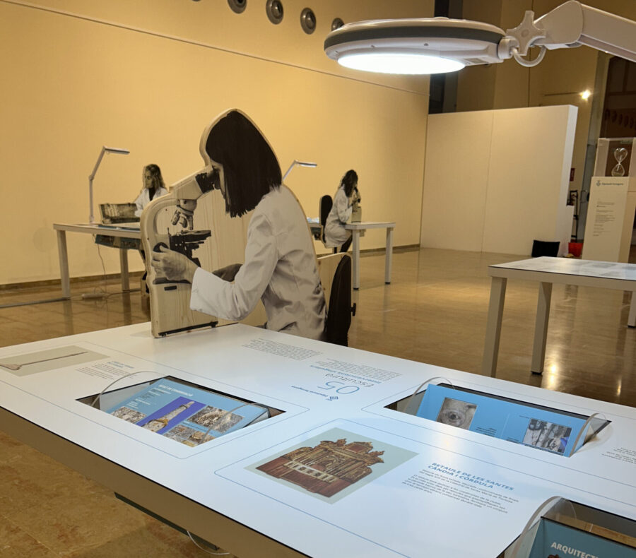 El Palau Bofarull de la Diputació acull aquesta mostra que fa un recorregut per diferents obres que la Diputació ha restaurat en els darrers anys. S’explica el procés mitjançant plafons situats en taules que simulen les que fan servir l’equip de restauradores, les quals hi estan representades amb siluetes de cartró ploma de mida natural.