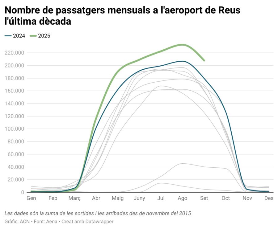 La xifra de gener a setembre del 2025 representa, a més, un augment del 12,9% en relació amb el mateix període de l’any passat. En el cas del mes de setembre, 207.811 passatgers han passat per l’aeroport reusenc, un 15,7% més que en els mateixos trenta dies de l’any passat.
